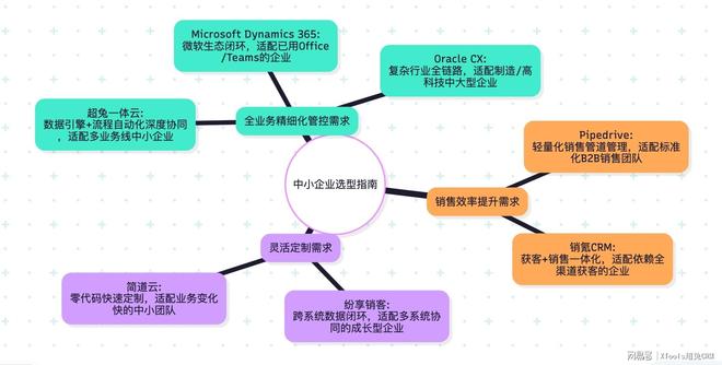 mindmap root((中小企业选型指南)) 全业务精细化管控需求 超兔一体云: 数据引擎+流程自动化深度协同,适配多业务线中小企业 Microsoft Dynamics 365: 微软生态闭环,适配已用Office/Teams的企业 Oracle CX: 复杂行业全链路,适配制造/高科技中大型企业 销售效率提升需求 Pipedrive: 轻量化销售管道管理,适配标准化B2B销售团队 销氪CRM: 获客+销售一体化,适配依赖全渠道获客的企业 灵活定制需求 纷享销客: 跨系统数据闭环,适配多系统协同的成长型企业 简道云: 零代码快速定制,适配业务变化快的中小团队