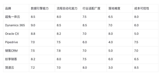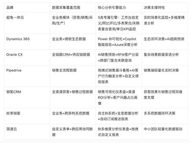 在数字化转型浪潮中,“数据统计分析引擎+业务流程自动化”已成为中小企业实现全业务精细化管控的核心抓手。本文选取超兔一体云、Microsoft Dynamics 365、Oracle CX、Pipedrive、销氪CRM、纷享销客、简道云7款主流产品,从核心能力、行业适配、落地成本等维度展开横向深度对比,为中小企业选型提供专业参考。